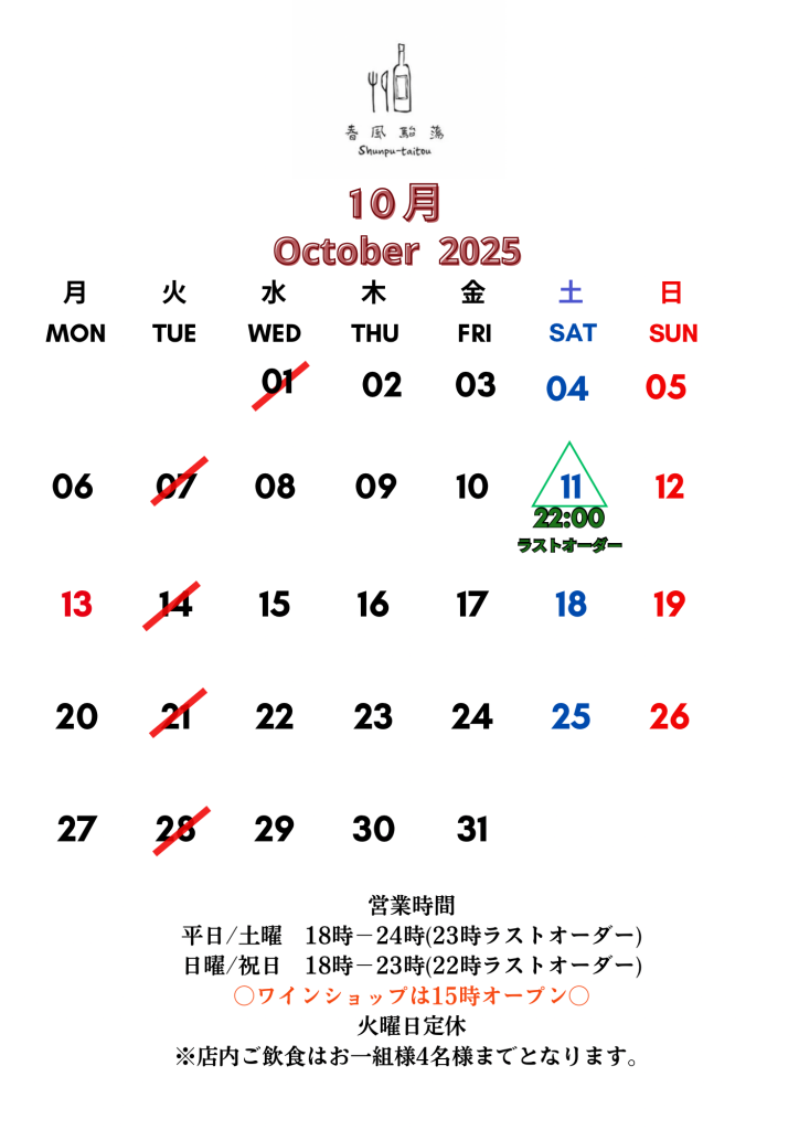 火曜日定休(追加で休業日をつくることもございます。Instagram、Facebookでお知らせします)