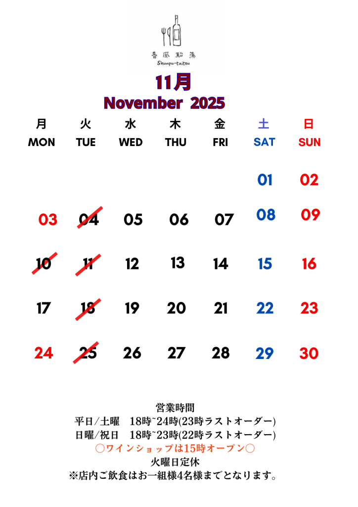 日曜日・祝日:18時~23時(22時ラストオーダー)